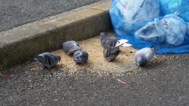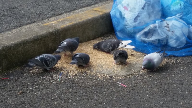 最近店前のゴミ捨て場にハトの餌をやってく人がいて、