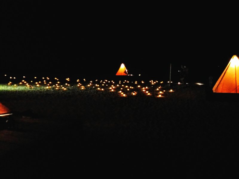 夜浜辺に出るとオレンジに光るランタンとテント。