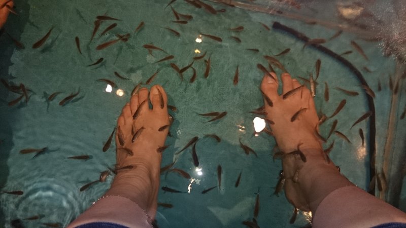 いざ!ドクターフィッシュ! 恐る恐る足を入れると、30匹ぐらい吸い付いてきて、ひゃー!! くすぐったくて、足を入れては出してしてましたが、慣れてくると心地よい刺激と自分になついているようで、なんだか可愛らしく思えました。