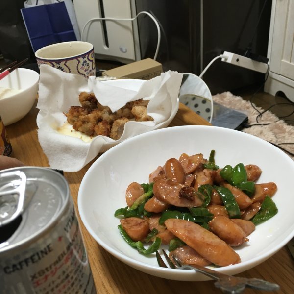 唐揚げとソーセージとピーマンのチーズ和えを作りました!! これに杏露酒とともにいただきました笑