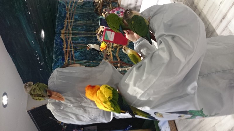 友達に話しかけようと振り向くと、頭、肩、腕に計5羽!? もはや鳥使いになっていました(゜ロ゜)!