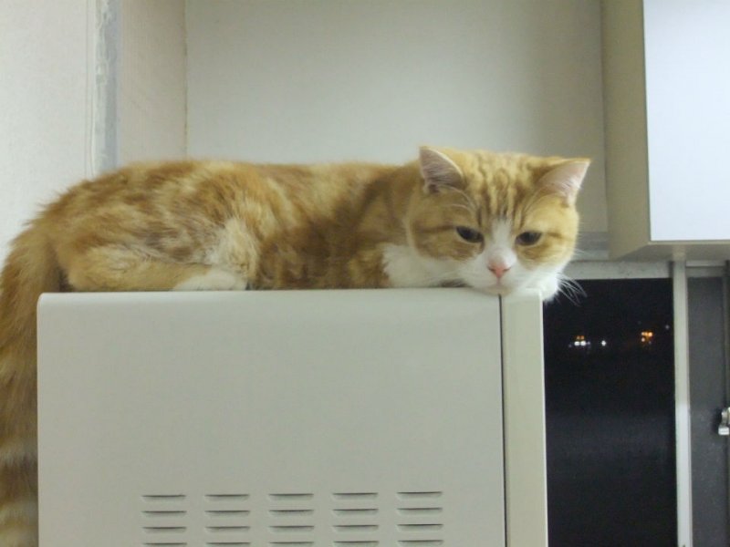 休憩時間は家に帰って休むのですが 可愛い猫がレンジの上で出迎えてくれます。 冷たいのが気持ち良いのかな?