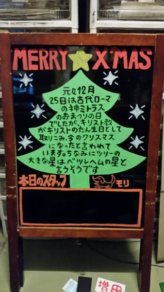 SRも今年は少しクリスマスを意識しておりまして、合わせてブラックボードも書き換えました。