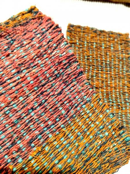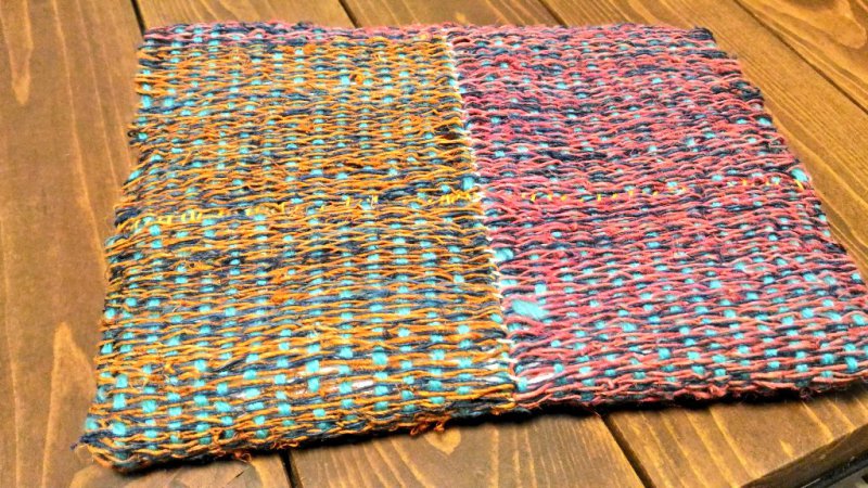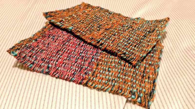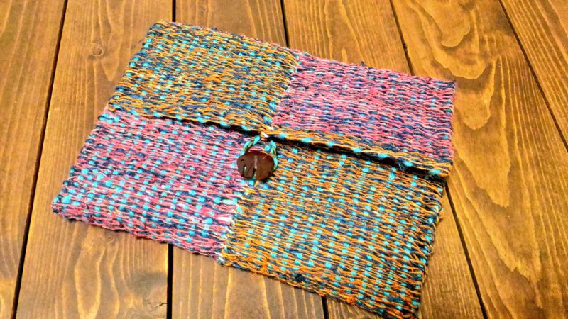 そんなわけで簡易機織り機を出してきまして、粗めの麻紐と毛糸で布を4枚こしらえ、つなぎ合わせてマルチケースを作成!久々の大物です。