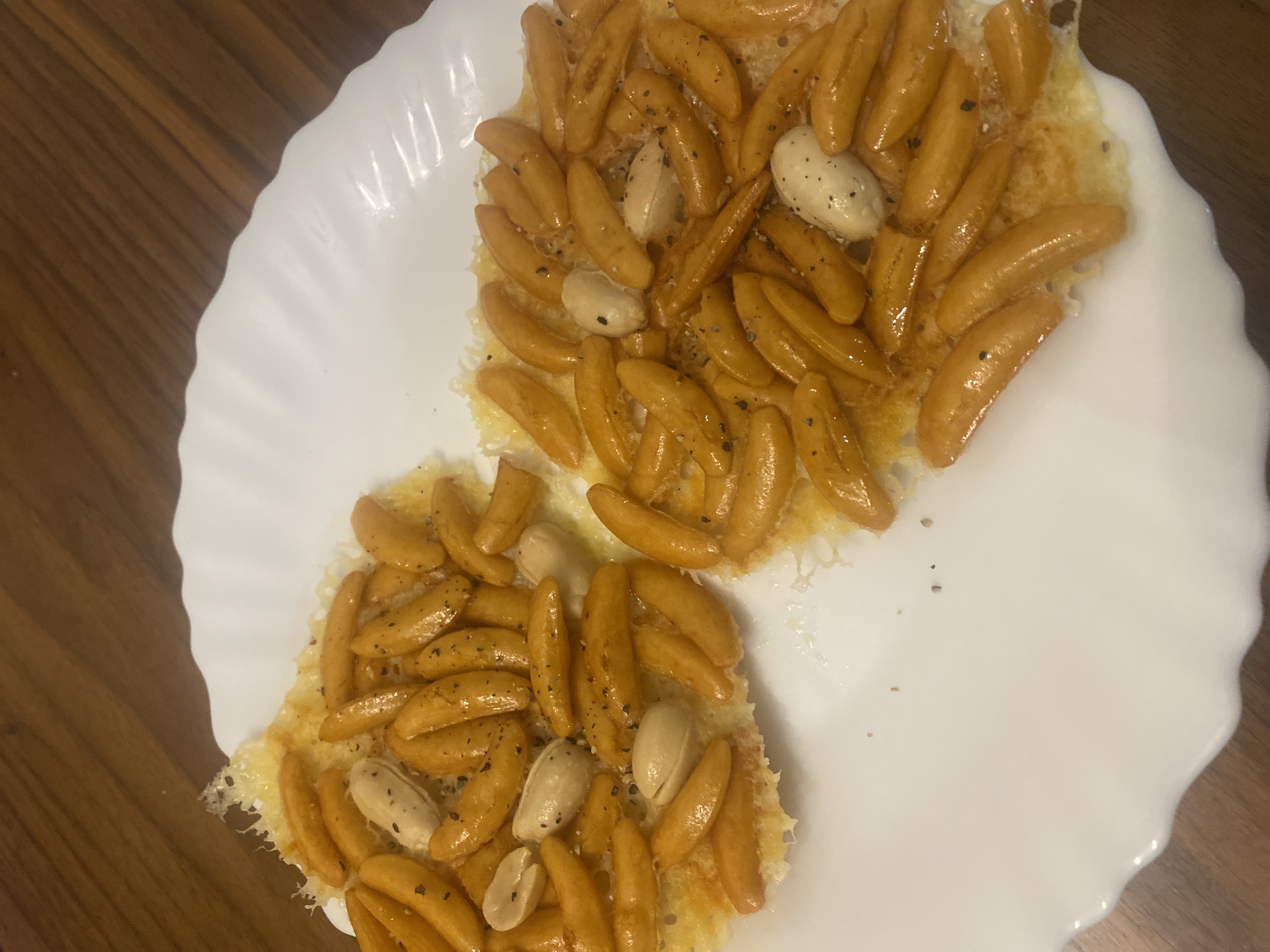 耐熱皿にクッキングシート、とろけるスライスチーズ、柿の種の順に乗せてレンチンするだけ✨️