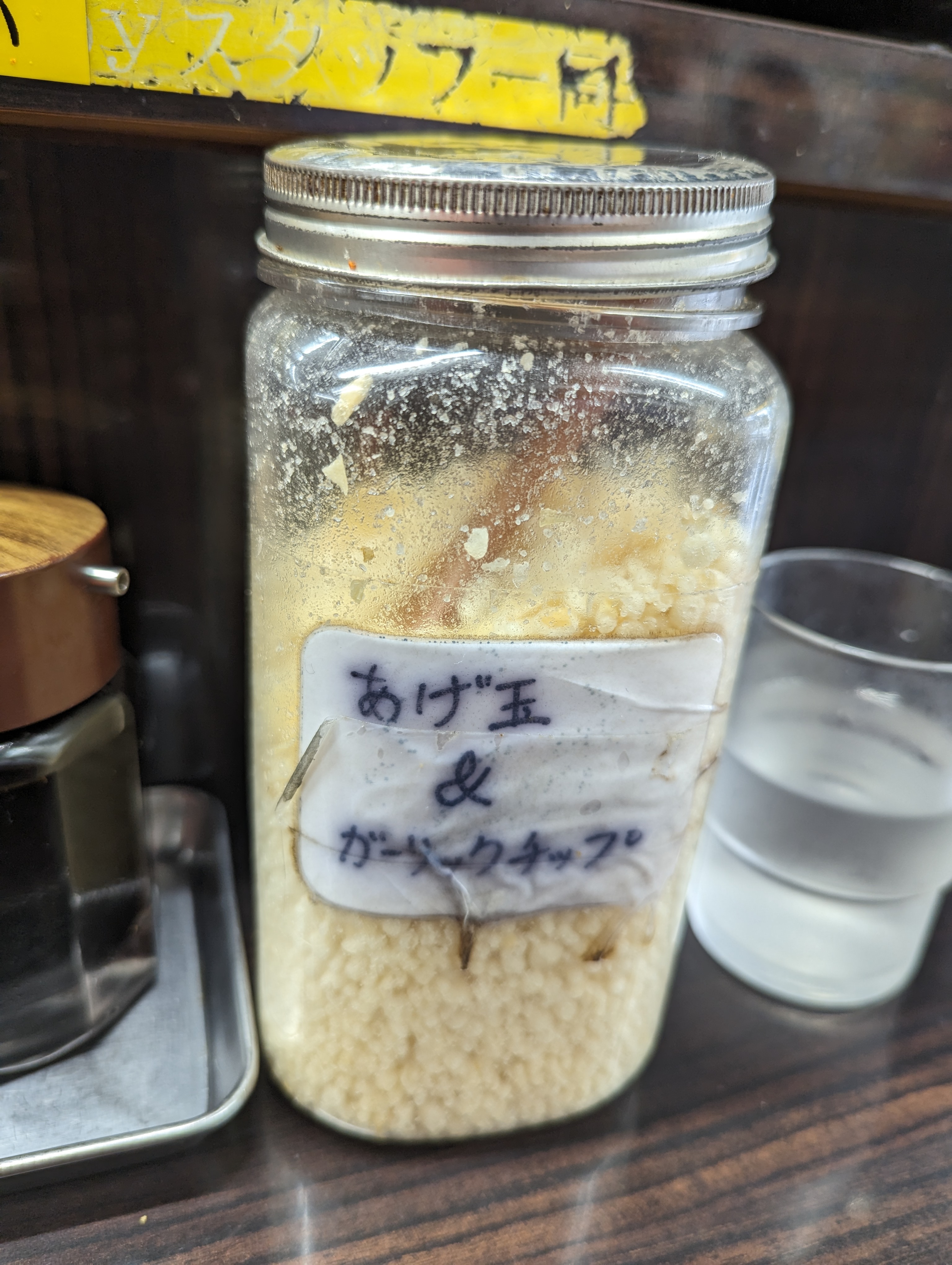 卓上には「あげ玉&ガーリックチップ」というギルティな瓶が置いてあります。