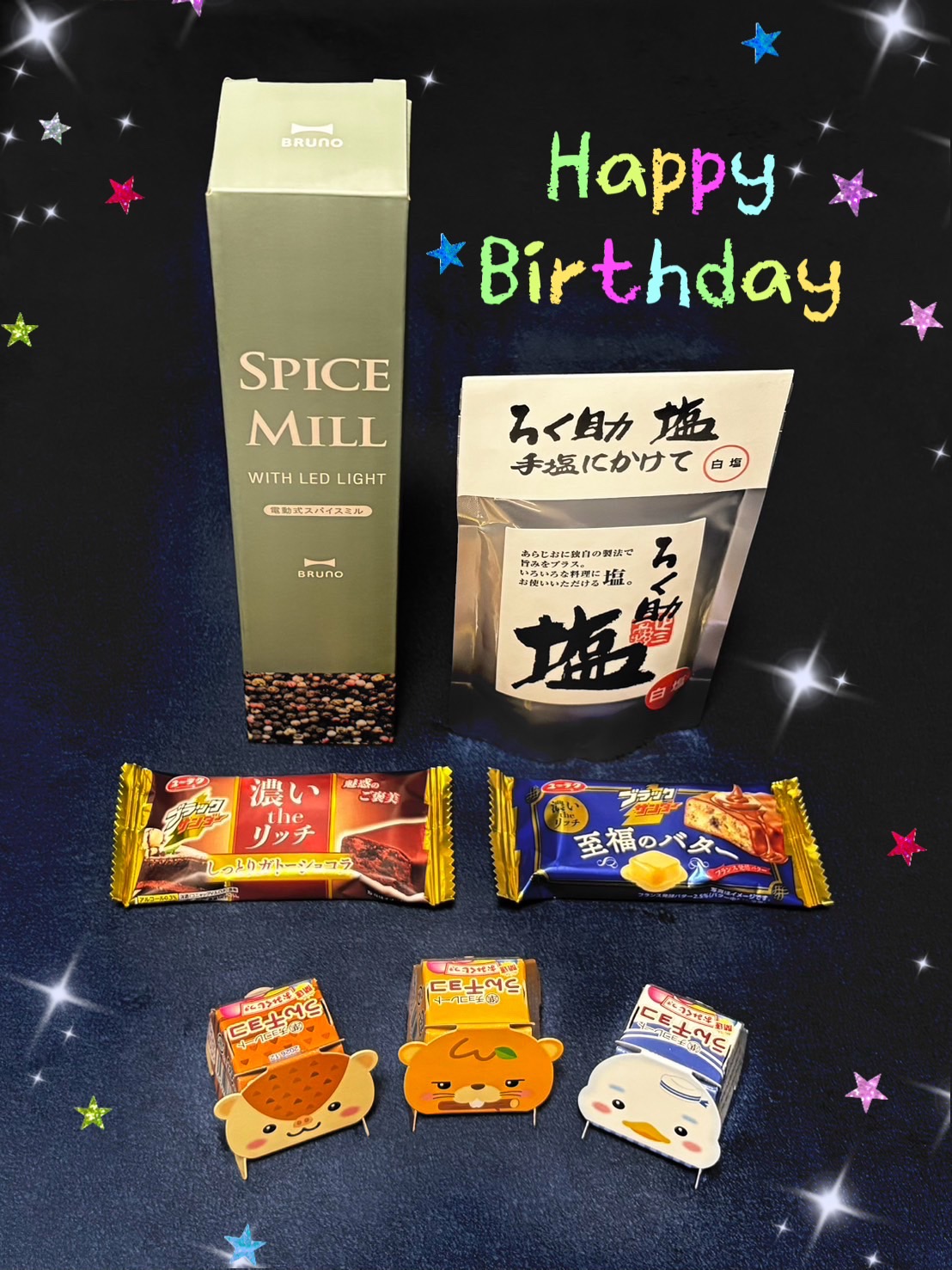 お誕生日プレゼントは電動ペッパーミル&ろく助の塩 +チョコでございます!