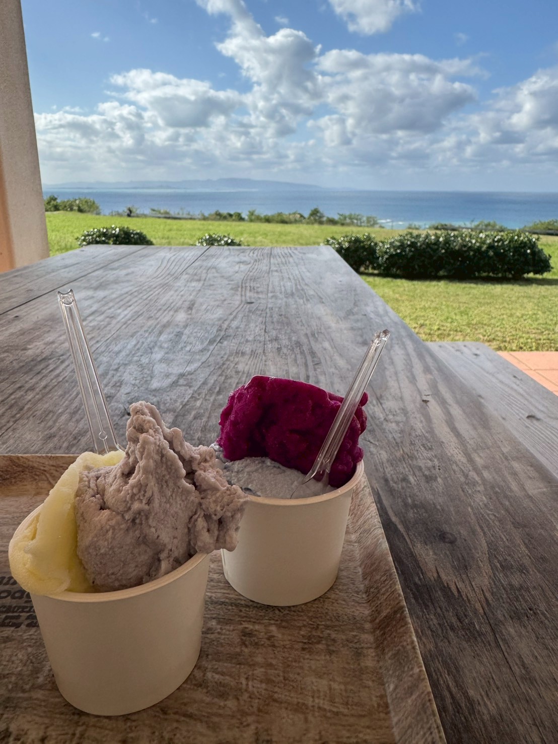 ①ミルミル本舗さんのジェラート(シークワーサー、紫芋、バタフライピー、ドラゴンフルーツ)