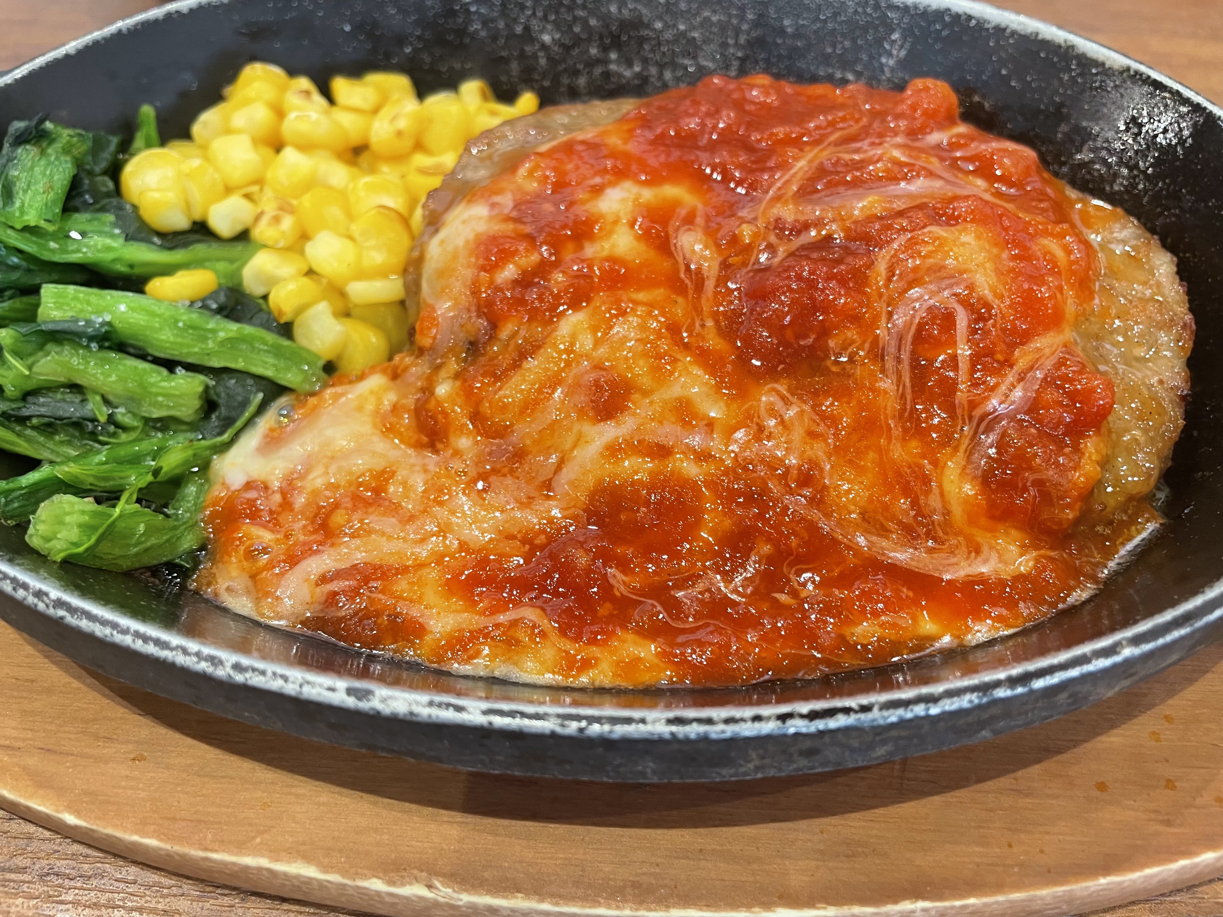 デミグラスハンバーグ、チーズトマトハンバーグ、アーリオオーリオペペロンチーノ、オニオンスープ、大満足です。