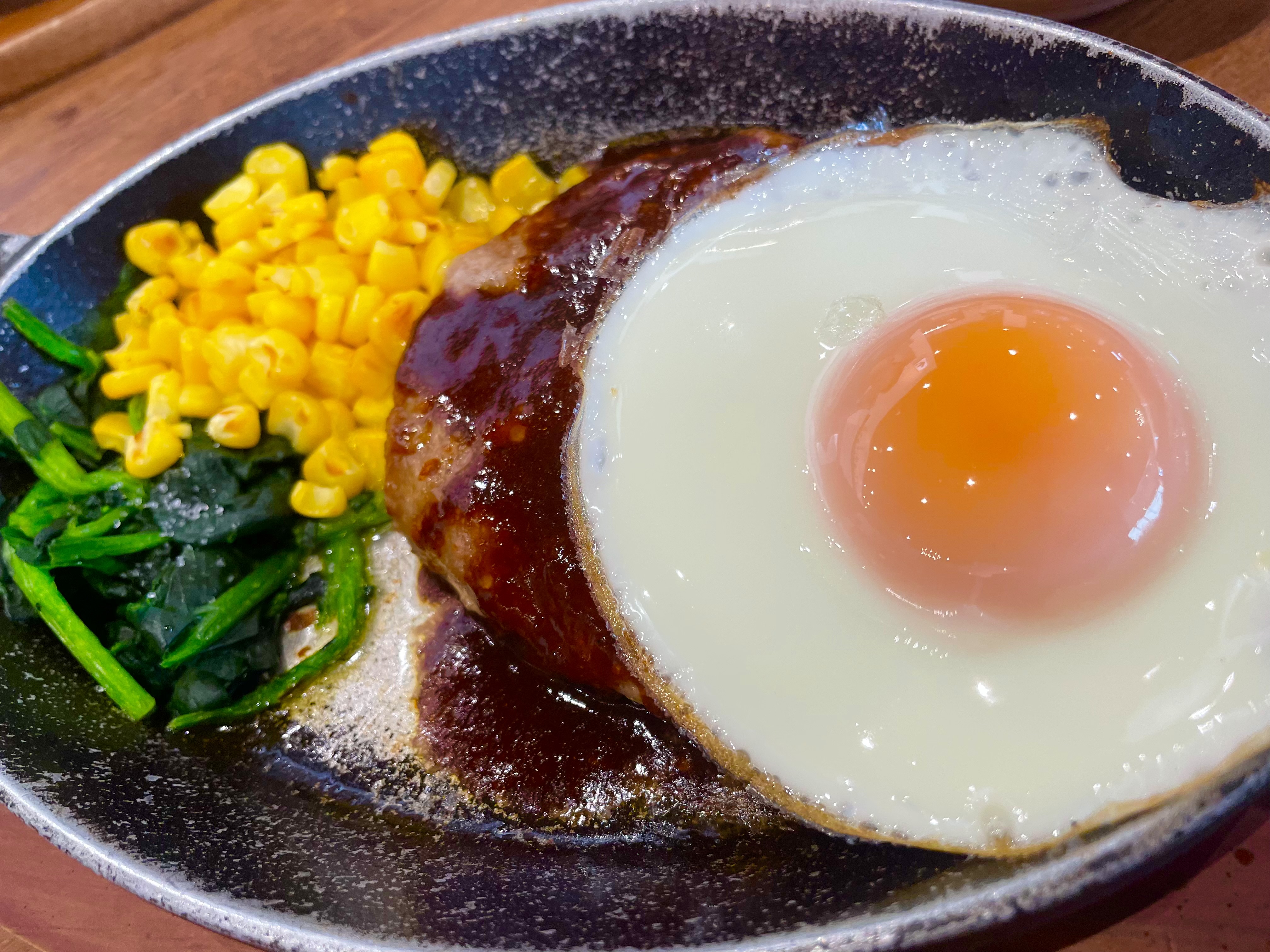 目玉焼きが乗っかってるのが最高に幸せです。ナイフで切ると黄身が、とろ〜と流れてめちゃおいしい〜です。ぐでたまみたいです〜