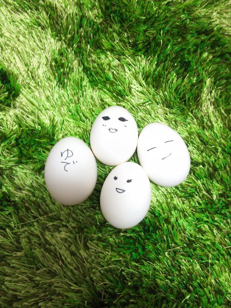 写真はゆで卵と生卵を区別するので、ゆでゆでゆでと書いていたのですが、つまらなかったので、顔を描きました。