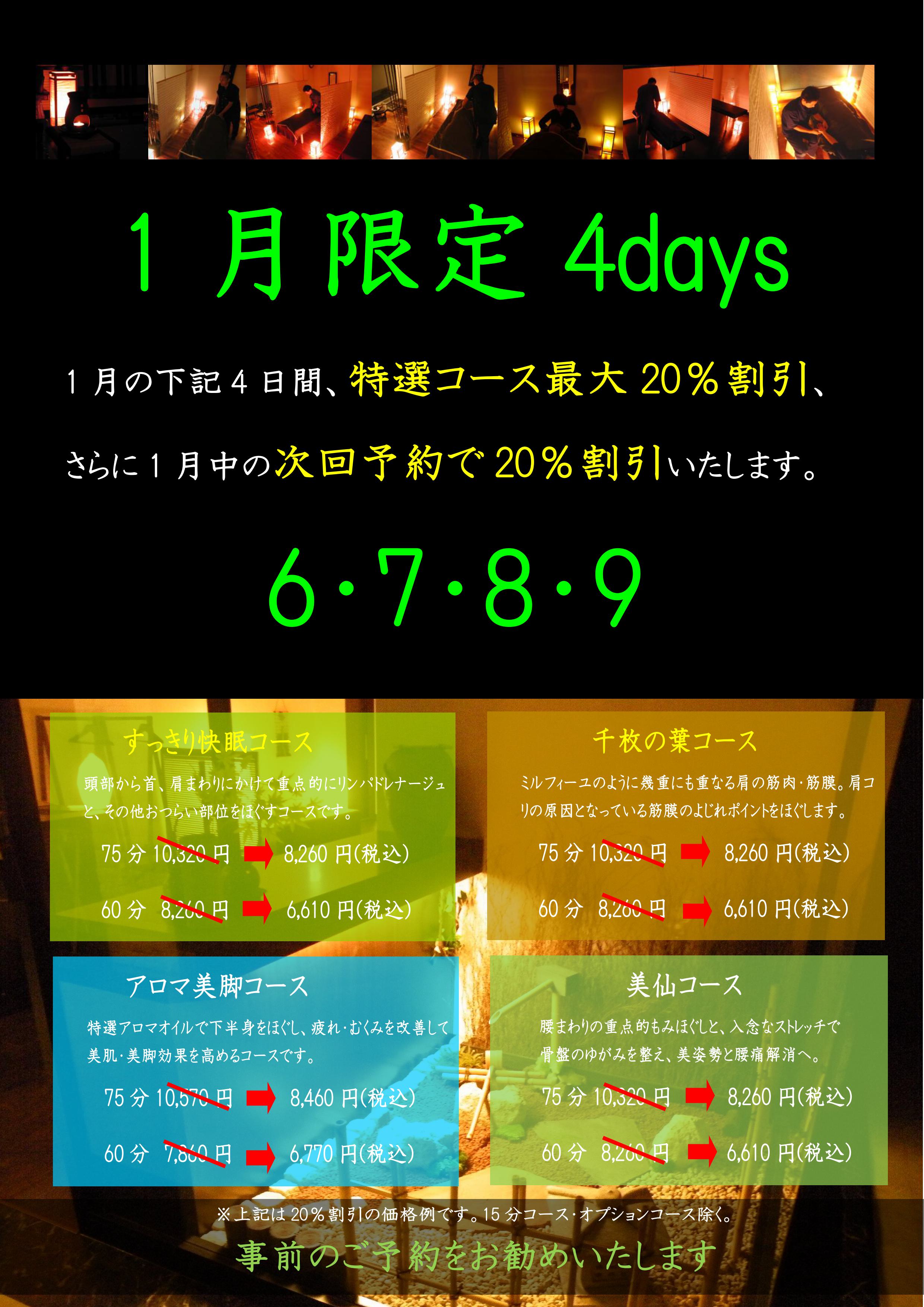 更にお帰りの際1月中のご予約をいただけると、どのコースでも20%割引になります♪