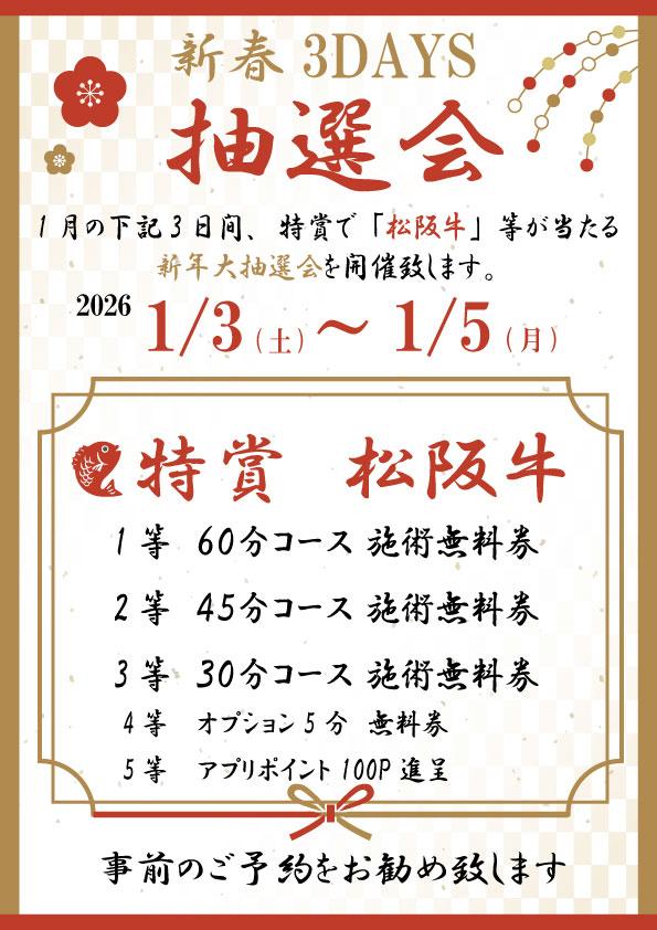 1月3日(土)~1月5日(月)の3日間は、松阪牛等が当たる「大抽選会」を開催致します!